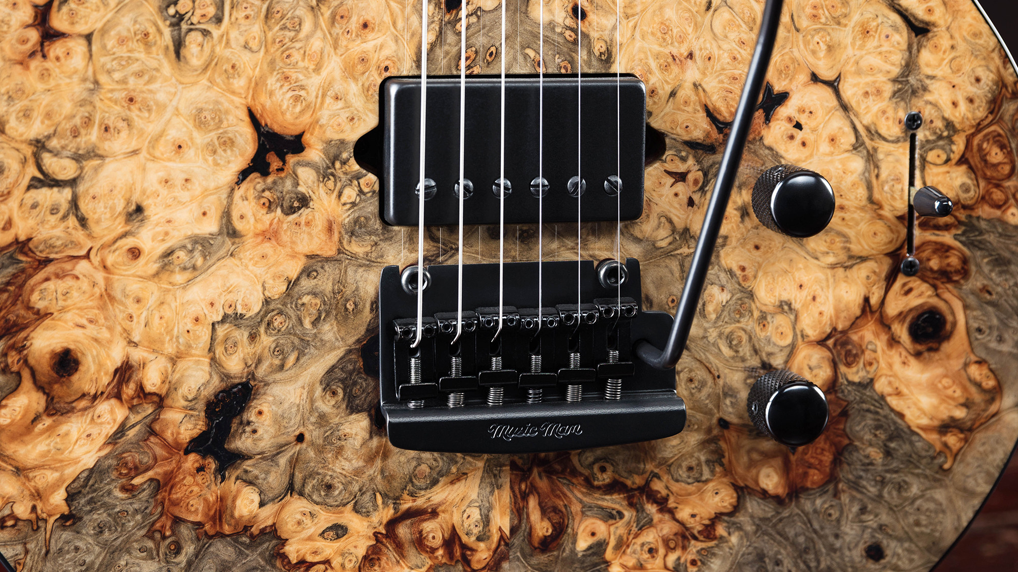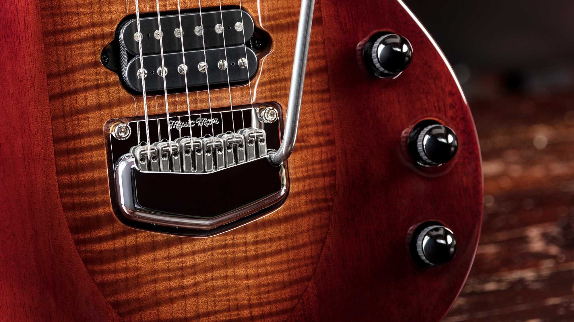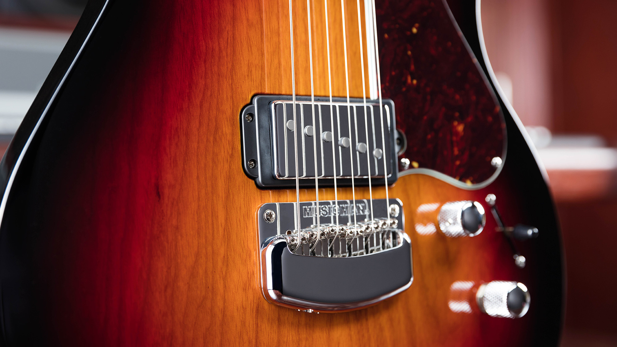 カスタム・ピックアップカバー、ミュージックマン・ビンテージスタイル・トレモロ、シャーラー・ロッキング・チューナーを含めたハードウェア類は黒で統一。