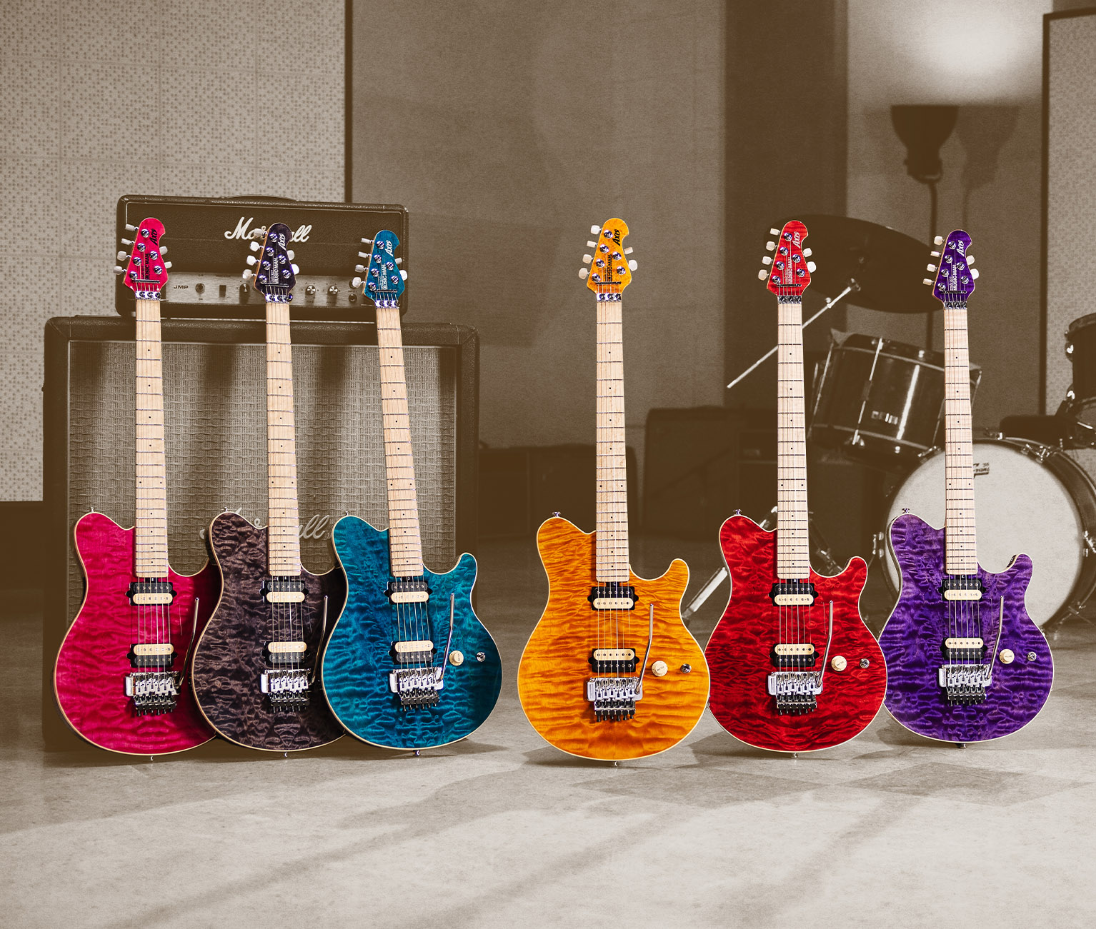 Hand stained quilt maple tops in six original translucent finishes.